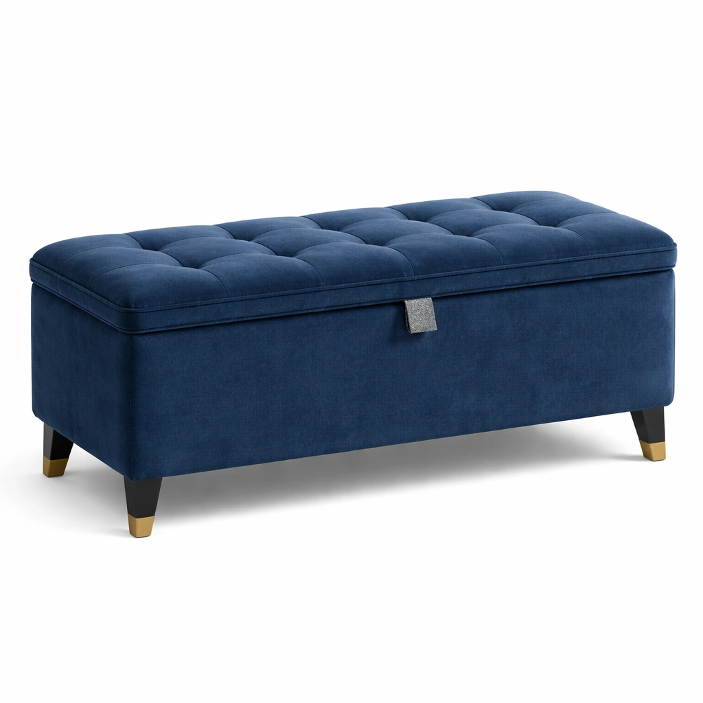 Banco de almacenamiento tapizado en terciopelo azul con patas de madera 120x40x45 cm