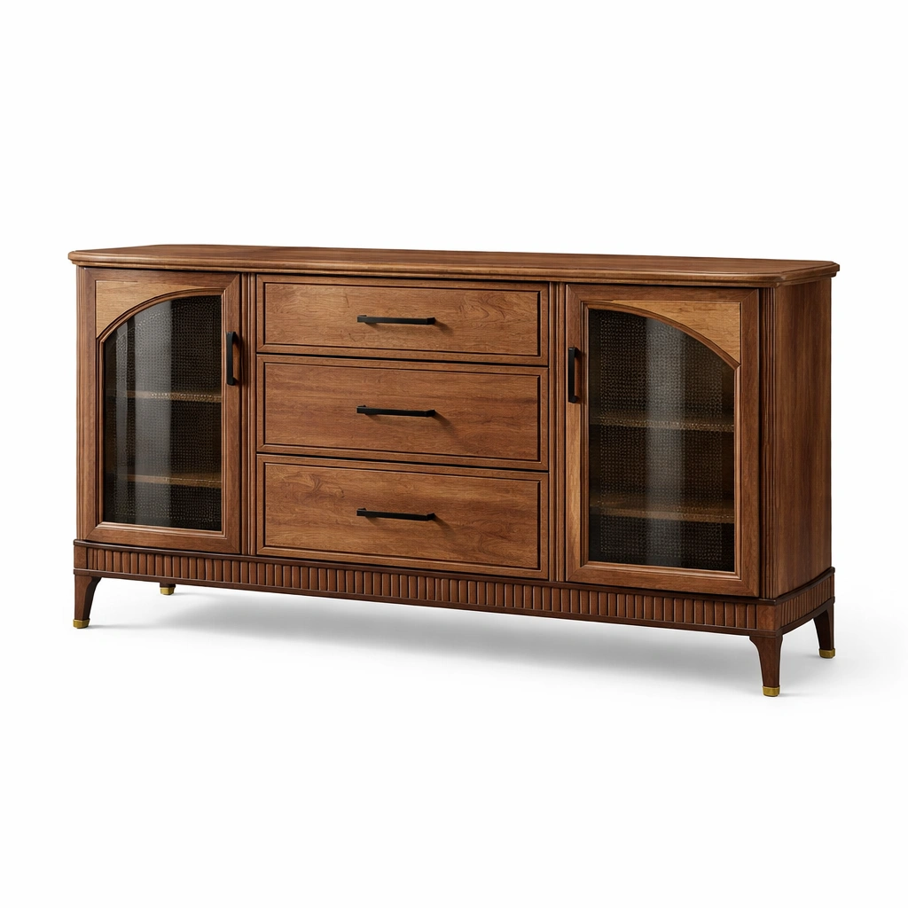 - Estructura: Tres cajones centrales y dos puertas de vidrio a los lados