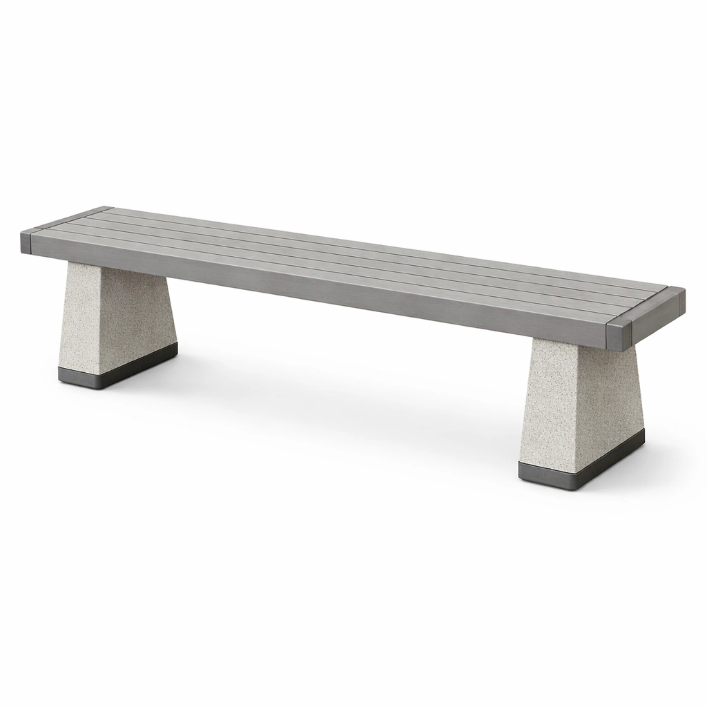 Banco fabricado con madera compuesta y soportes de hormigón. Capacidad de carga: 250 kg. Color gris. Peso: 35 kg. Evitar la exposición prolongada al agua y limpiar con un paño seco.
